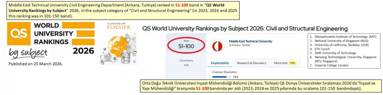 Middle East Technical University Civil Engineering Department (Ankara, Turkiye) ranked in 51-100 band in “QS World University Rankings by Subject” 2026, in the subject category of “Civil and Structural Engineering” (in 2023, 2024 and 2025 this ranking was